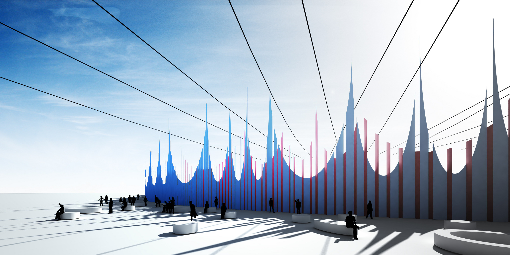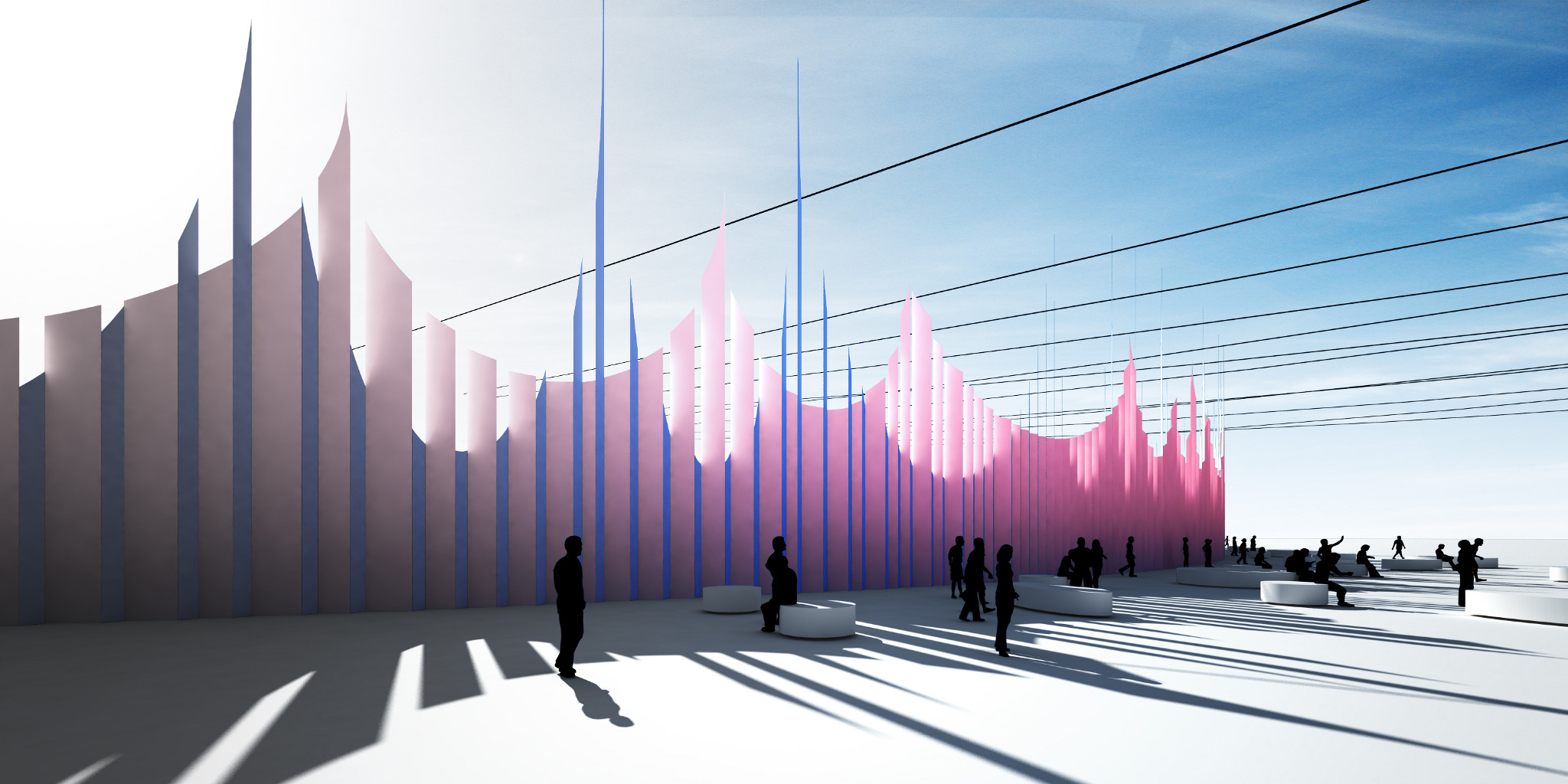 Second, I suggest a dressing for the substation to generate its full identity. It creates a clear separation of the restricted area and provides a distinct area for public space. Without the wall, the blurred area is considered to be abandoned or dangerous. The more clearly we suggest the existence of wall, the more clearly we reclaim this public space. Most of time the sun comes from the side of the substation, which is South of the road. Therefore, the crown-like cutting of wall will render very active and sharp shading patterns within public area right in front of wall. The shadows will sensitively respond to time. The top of the wall, which is at a sharp pitch will be lower than the necessary overhead line. However, if it is allowed, the pitch can happen between the overhead lines to embrace the gesture.