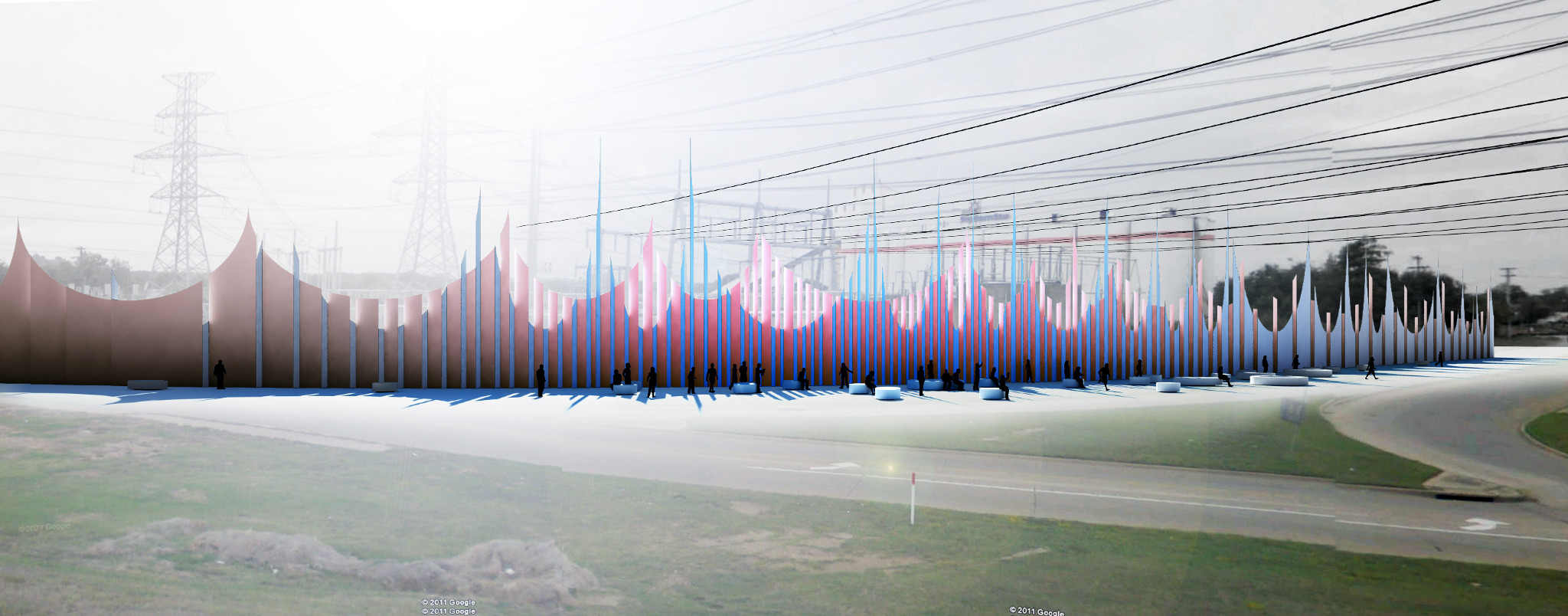 The only effective intervention to the substation is the creating wall surrounded with it, meaning a new dress for the substation. By using “Color of Substation” and intentional variation of color and shapes depending upon direction of approach, we will provide a strong identity, and the substation can transform into a new landmark of Dallas in the peoples’ mental map.