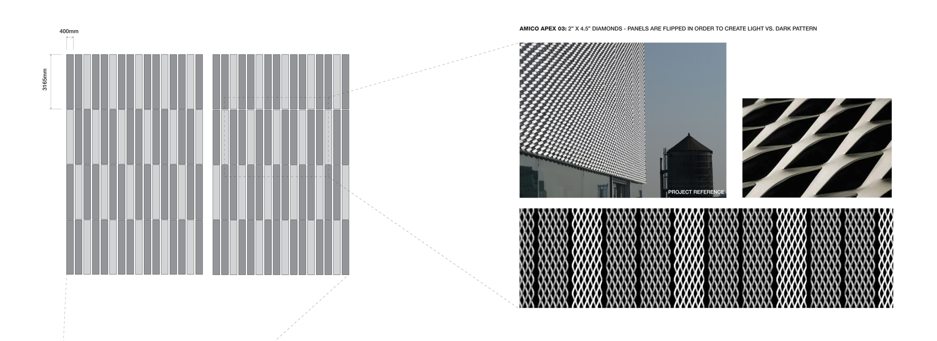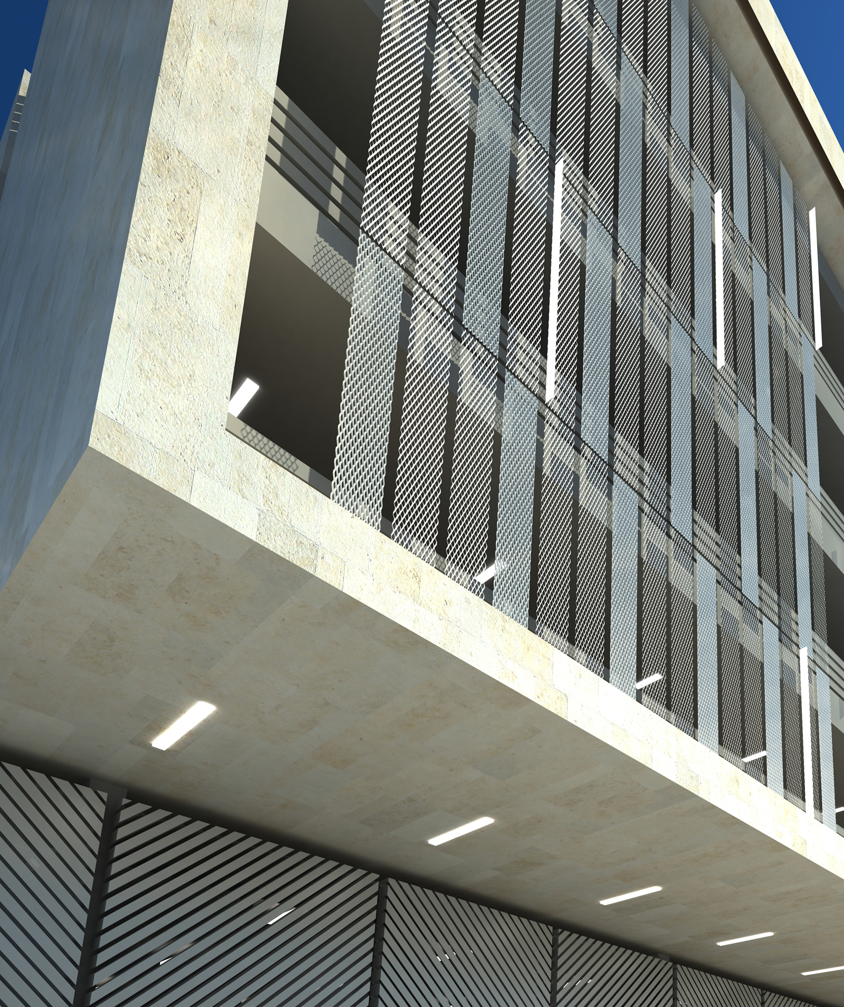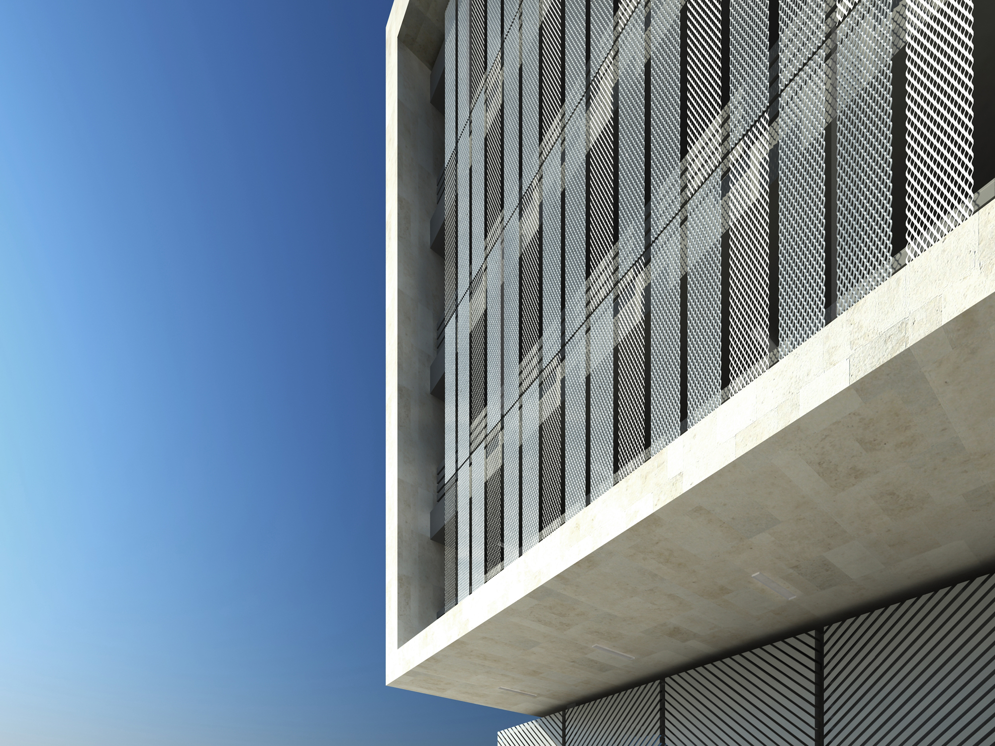 Monumentality with texture. In order to deal with significant need of parking space and to maintain the alignment and clarity of the main campus master plan, each materials such as stone, textured metal and diagonal grilles are composed.